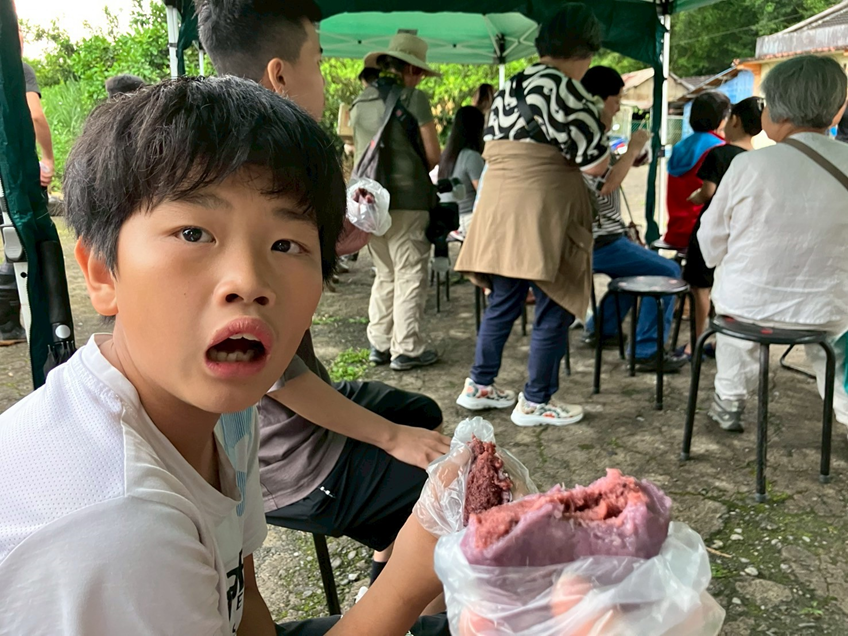 這次孩子們認真的看著戲劇演出,荒野保護協會與果陀劇團的合作,呈現了早年的雙連埤生活樣貌與開墾時期時,從日治時期到現在的民主政府、從桃園走路到宜蘭拓墾起厝,從製粿到成品的每一個步驟,用愛把餡料揉進每個粿裡面…每個過程,都在這齣初場秀裡完整呈現了!