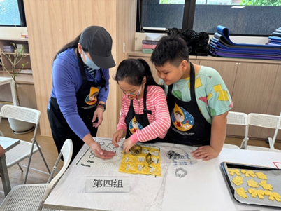 如果讓麵團回溫太久,不但難以壓模,還可能變得黏糊糊。家長們也一旁幫忙,將壓好的餅乾放到烤盤紙上,幸好大部分親子都順利完成壓模,並送進烤箱烘烤。