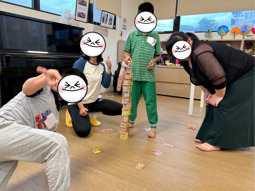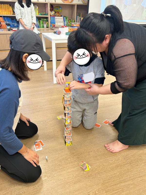 第三堂的「超級犀牛」,現場氣氛完全炸開。紙牌一層一層往上疊,只要一個不穩就全倒,孩子們緊張到大叫,家長也忍不住跟著喊:「慢一點、等等我!」